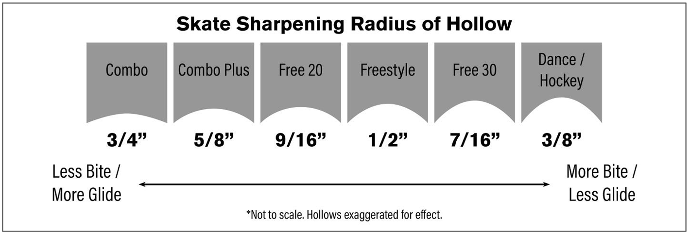 - Beginners often start with a Combo Plus (5/8”) sharpening. As skaters progress and start more complex skills, they may want to move to a Free 20 (9/16”) or Freestyle (1/2”).